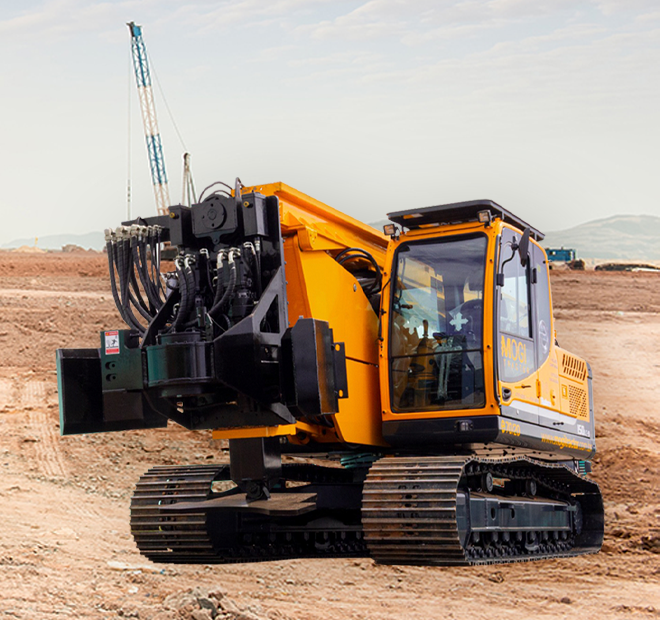 Ideal para perfurações de estacas mais profundas com diâmetros maiores e solos mais resistentes. Equipamento com prolongador de esteiras, que oferece maior estabilidade no solo.
